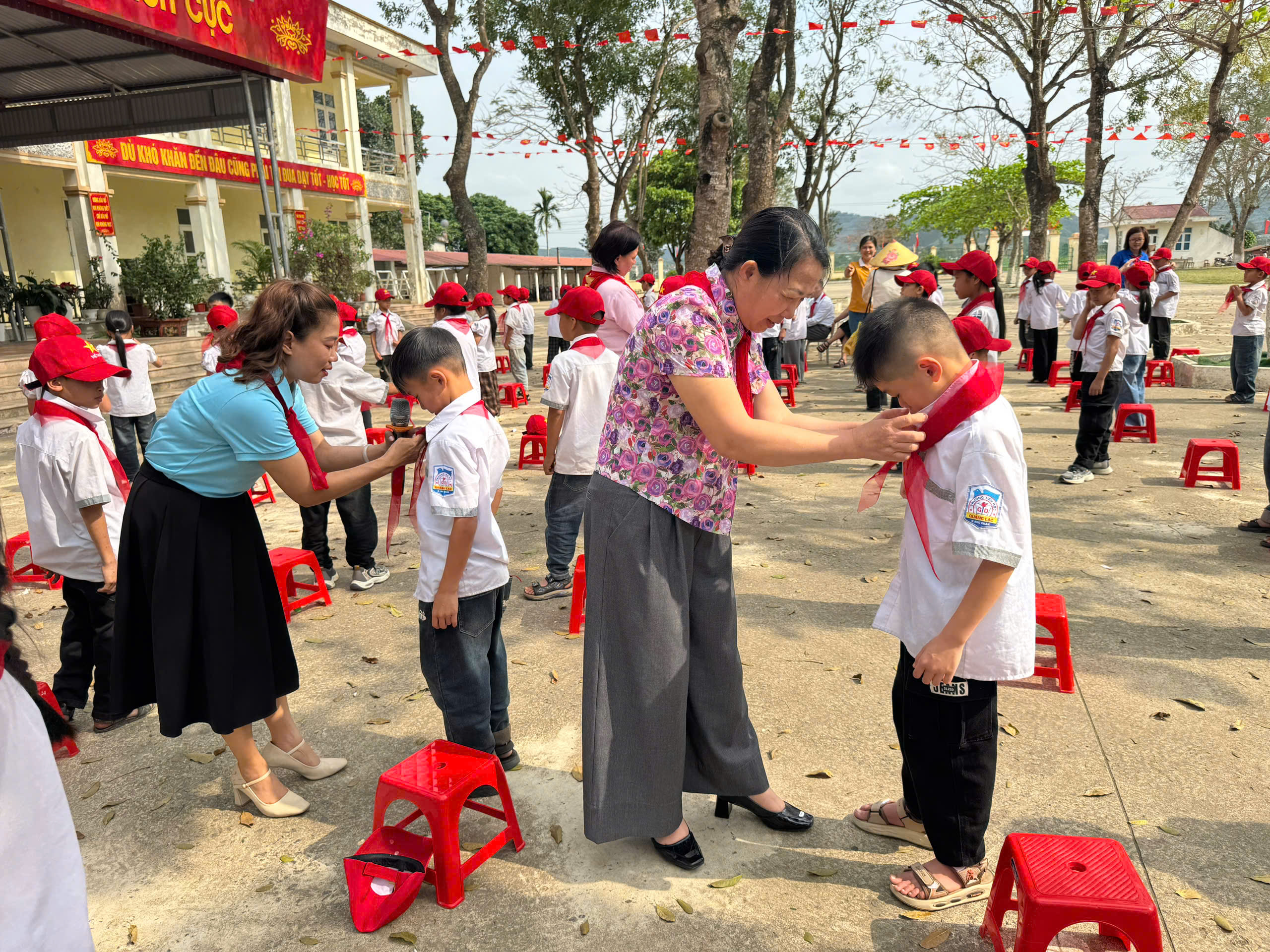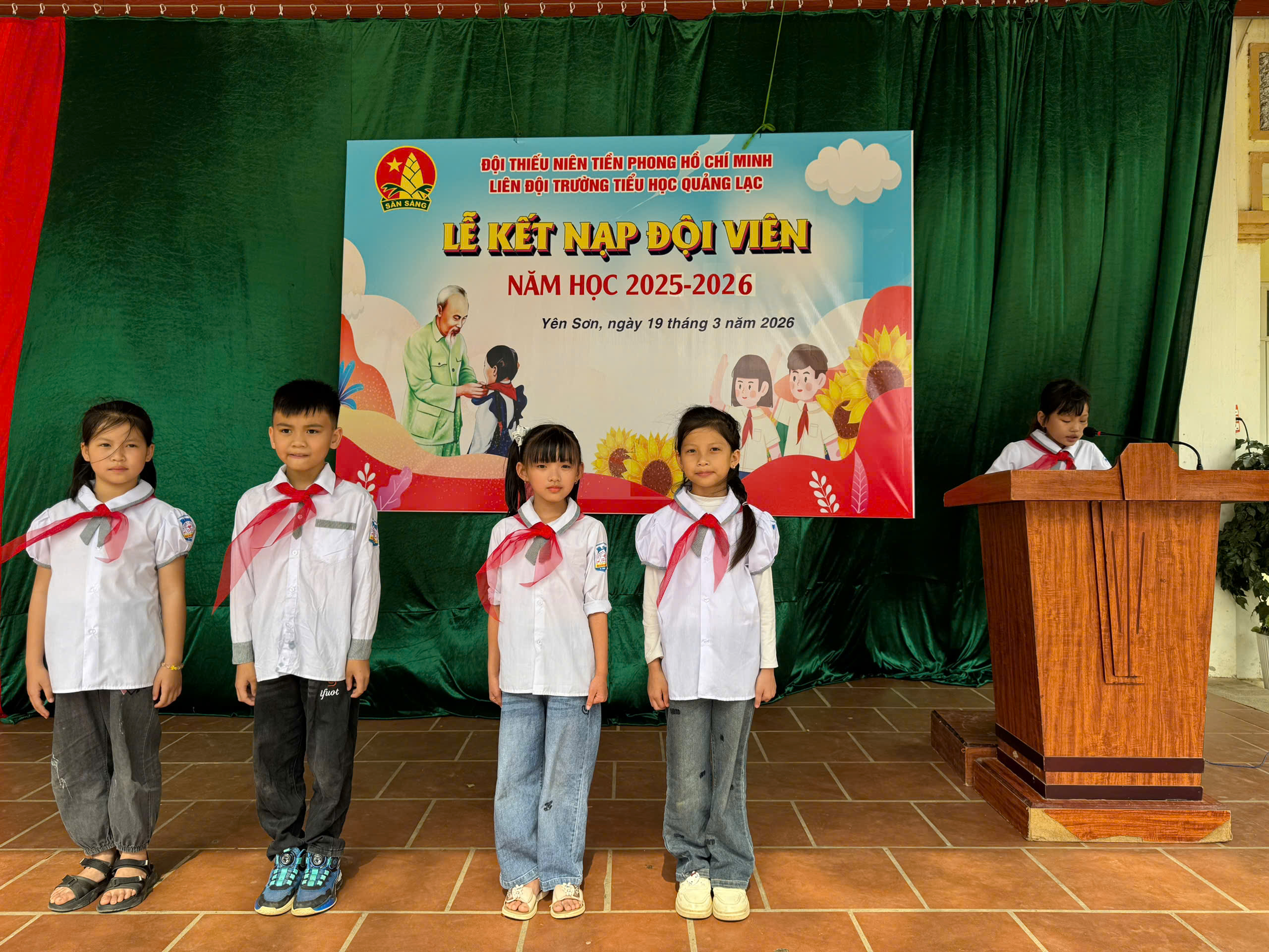 Được đứng trong hàng ngũ Đội Thiếu niên Tiền phong Hồ Chí Minh là vinh dự, niềm tự hào đối với các em. Vì từ hôm nay, các em được mang trên vai chiếc khăn đỏ thắm màu cờ Tổ Quốc. Màu khăn đỏ như nhắc nhở các em phải phấn đấu vươn lên không ngừng để trở thành Đội viên tốt, xứng đáng là con ngoan trò giỏi – cháu ngoan Bác Hồ. Giây phút thiêng liêng này sẽ là kỷ niệm đẹp của tuổi học trò của các em.